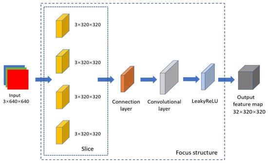 Focus structure can be a further feature extraction; the key step is to perform a slicing operation on the image. The 640 × 640 × 3 image is divided into four slices after the slicing operation, and the size of each slice is 320 × 320 × 3. The connection layer combines four pieces together, resulting in a feature map of size 320 × 320 × 12. Then, after one convolution operation with 64 convolution kernels, the feature map of 320 × 320 × 32 is formed []. The focus structure is shown in Figure 5.