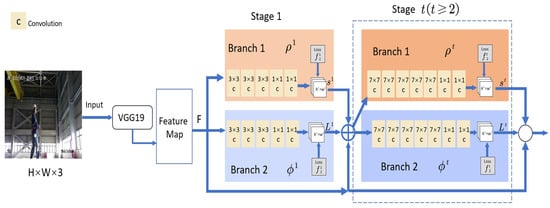 OpenPose human body posture recognition project is an open-source library written by Mellon (CMU) based on convolutional neural networks and supervised learning with Caffe (Convolutional Architecture for Fast Feature Embedding) as the framework []. OpenPose network structure is two-branch, using the “two-branch multi-stage CNN” scheme. Figure 6 shows the OpenPose network structure. The upper branch is responsible for predicting the confidence map of the key points and generating the heatmap of the key points. The lower branch is responsible for predicting the part affinity fields between key points and generating the vector graph of key points []. Part affinity fields is a two-dimensional vector of each limb of the body, which also holds the position and orientation information between limb regions []. First, the VGG-19 (visual geometry neural network with 19 layers) deep neural network performs feature extraction on the input image, resulting in the generation of feature map (F). In stage 1, the input is F, the output is the key point heat map S1, and the partial affinity domain L1 after the convolution operation. Next, from the stage 2, the inputs are the two prediction results of the previous stage and the image features F. Accordingly, the inputs for each stage are as follows []: