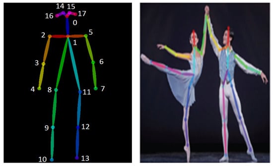 The OpenPose network can realize the detection of 18 key points of human body, and the change of human body posture can be expressed by the information of 18 key points. The skeleton diagram of the human body is shown in Figure 7.