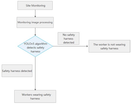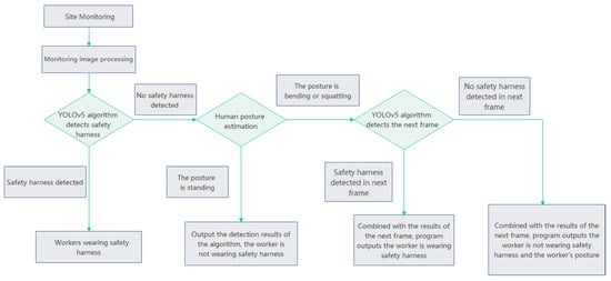 In previous studies, scholars improved the accuracy of the algorithm to detect object features by improving the object detection algorithm, which had significant implications. However, in some practical applications, because the features of the object are easily obscured by other objects, the results of the algorithm detection may not match the real situation. In this study, at the beginning, the program detection flow is shown in Figure 8. When the worker’s posture is bending down, squatting, the feature of safety harness is obscured by the limb, and it is difficult for the program to detect the safety harness and the output result does not match with the real situation. Therefore, we have redesigned the program detection flow. The flow chart is shown in Figure 9.