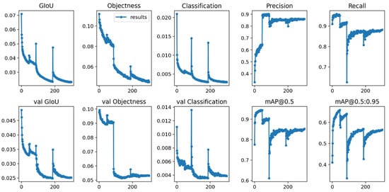 For YOLO algorithm object detection, the metrics to evaluate the detection performance are loss function (GIOU), recall (Recall), precision (Precision), validation set loss function (val GIoU), average accuracy mean (mAP), etc. The model was trained 299 times; the test results are shown in Figure 10.
