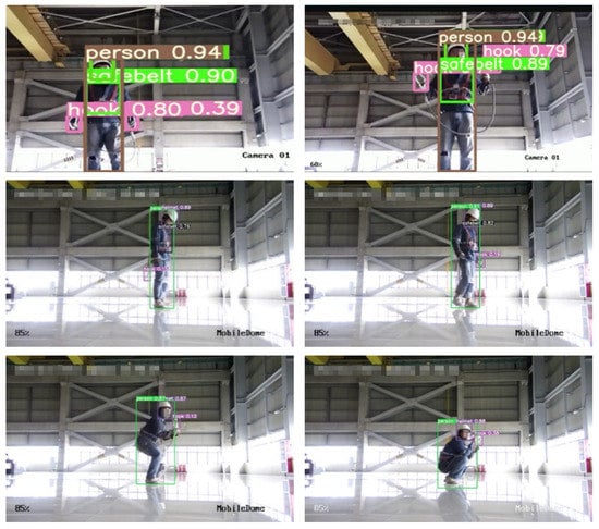 The GIOU value finally stabilized at about 0.02, which indicated that the difference between the predicted and actual values of the model for the object is small. The precision value was around 88%, and the recall value was around 86%. Precision represents the ability of the model to find relevant targets, i.e., the ability of the model to hit the true target among all predictions given, and recall represents the ability of the model to find relevant targets among all targets. We observed the value of the precision rate with the value of the recall rate and found that the model was more accurate in predicting the safety harness. In order to directly showed the detection results of the algorithm, the detection images were selected for illustration, as shown in Figure 11.