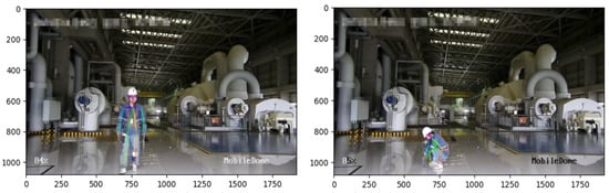 As we can be seen in Figure 11, when the features of safety harness were obvious in the image, the model had very good recognition of the safety harness, accurate positioning, and the accuracy could reach up to 90%. When worker was bending or squatting, we found that the features of the safety harness were obscured by the worker’s limbs, and the model was not able to detect the safety harness. In summary, the YOLOv5 algorithm had excellent effect in this aspect of the safety harness detection in the workshop.