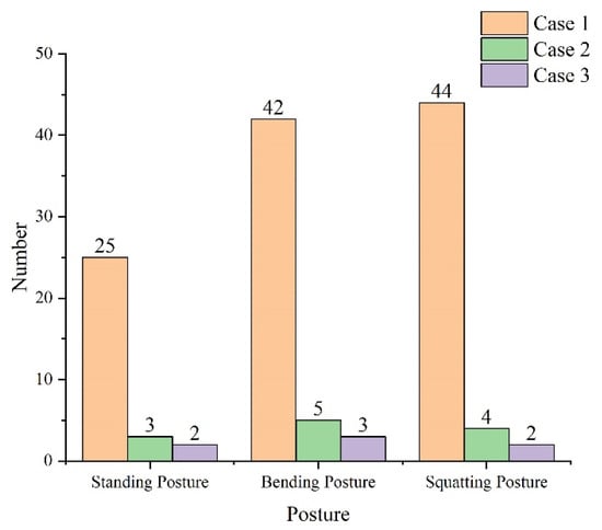 In the posture test, there were three outputs possible. In the first case, the program outputted the correct result; in the second case, the program did not output results, this was because the confidence level of feature points detected by the algorithm was too low; in the third case, the program outputted a result of posture detection that did not match the real situation. For example, a worker was standing, but the output of program was that the worker’s posture was bending. Using the statistics of 130 experimental results, the specific situation is shown in the Figure 13. Case 1 accounted for the majority of all test results, demonstrating the feasibility and accuracy of the designed criterion for judging human body posture.