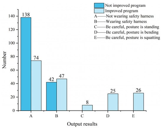 According to the designed program flow chart (Figure 9), we wrote the YOLOv5 model and the OpenPose model, and added some judgment rules into the program code using Python language. During the test, the program reads a video of three minutes in length. Because the detection speed of YOLOv5 algorithm was very fast, in order to enable the program to detect safety harness in real time, we controlled the speed of outputting the result to once per second. Therefore, the program outputted a total of 180 results. We designed five categories for the output results, which were “Not wearing safety harness”, “Wearing safety harness”, “Be careful, posture is standing”, “Be careful, posture is bending”, and “Be careful, posture is squatting”. The five categories were represented by “A”, “B”, “C”, “D” and “E”, respectively. After the program detection was completed, we verified the 180 output results with the contents of 180 frames of images. Finally, statistical analyses of the data were performed. In addition, we compared the results of the improved program detection with the results of no improved program. For the not improved program, only the YOLOv5 model was used in the test. The experimental results are shown in Figure 14.