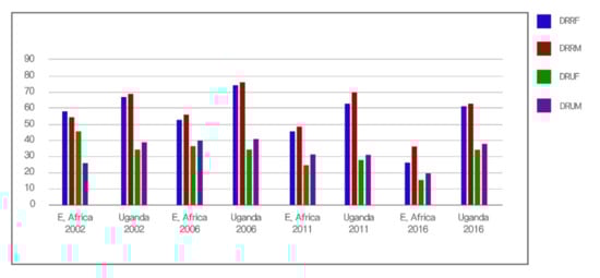 Early marriage and childbearing also lead to the school nonenrollment and dropout of girls. While early marriage and childbearing rates for girls under 15 years are as high as 18% and 8%, respectively, in Sub-Saharan Africa, they are expected to engage only in household chores after marriage [,,]. At the same time, the husband dominates the economic decisions of the household, which renders investment in girls’ education economically irrational for parents [,]. As the marriage of underage girls leads to additional household income through dowries [], child marriage is considered to be a better investment for girls than their education []. Girls born to young mothers tend to have a shorter schooling period compared to other girls [], which creates a vicious circle involving child marriage and fewer years of education. In Uganda, the sex of students continues to be a cause of dropouts, though the UPE has alleviated the disparities to some extent []. Ref. [] who analyzed the factors affecting gender-dependent enrollment rate in Uganda, reported that boys’ attendance rate increased with age when the father was the head of the household, and reduced when the family resided in the central region. Girls’ attendance rate increased with age when the mother had a high educational qualification.