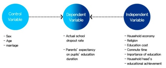 We separately set the actual dropout rates and parents’ expectations about the pupils’ educational years as the dependent variables to distinguish the effect of socioeconomic causes and parents’ feelings and preunderstanding of children’s education. We conducted separate regression analysis by gender, considering the age and marital status of the head of the household as control variables. Independent variables were self-perceived household economic status, religion, household head’s educational attainment, educational cost, commute time, and the household head’s perception of education. The first dependent variable, child dropout, was analyzed through binary logistic regression analysis; multiple regression analysis was performed to analyze the effect of parents’ educational expectation level as a continuous variable. Figure 2 shows the analytical model.