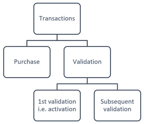 The research included data on types of purchase transactions, activation, and validation of tickets. Every ticket issue transaction is recorded as a purchase. The first use of the product is recorded in the IJPP system as product activation, while each subsequent use of the product is recorded as product validation. Activation thus represents the first validation of the product. Part of transactions scheme of the IJPP system, relevant for the study, is shown in the Figure 2.