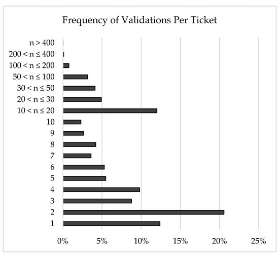 The responsiveness of the obtained free ticket activation is recorded as the reaction time between the types of purchase and activation transactions. The average reaction time was 22–75 days. The authors analyzed the frequency of use to understand the use of the free ticket product. Further, they determined the frequency of use by comparing all activations and validations for all activated products. The average frequency of use for the study period was 11 validations. Frequency of free ticket validations is Figure 4.