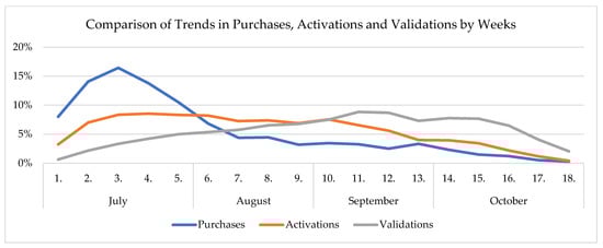 Comparison of trends in purchases, activations, and validations of free ticket by weeks.