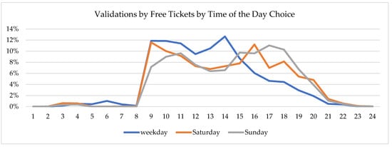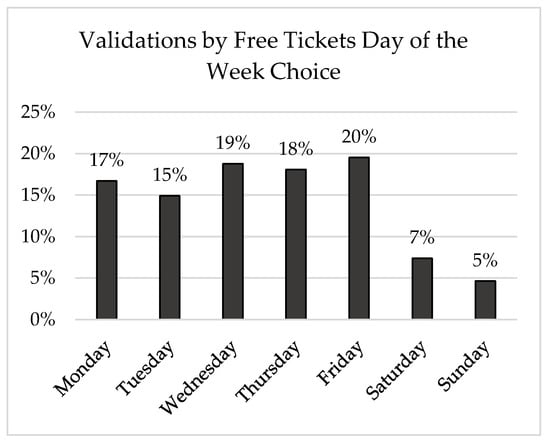 The study analyzed data for the time of the day choice and the time of the week choice. Most free ticket validations were performed on weekdays (88%). Travel demand of free ticket holders by day of the week is shown in Figure 6.
