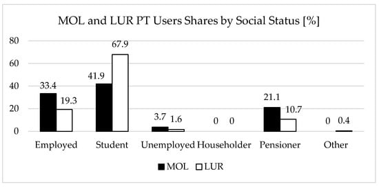 Some data for before-after analyses are available for Municipality of Ljubljana (MOL) and Ljubljana Urban Region (LUR) [33]. In 2014 household surveys, travel diaries on the sample of 1% of the entire population were collected. The data showed that pensioners in LUR accounted for 10.7% of public transport users in the region. The entire PT, both urban and regional, was covered in the research. MOL and LUR PT user shares by social status are shown in Figure 8.