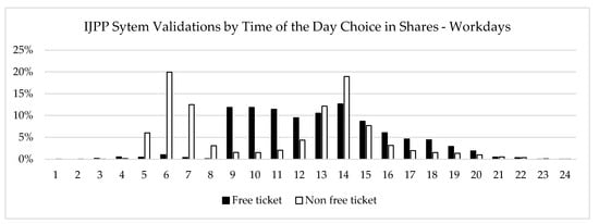 Time of the day choice comparison of free ticket and non-free tickets validations in the IJPP by shares—workdays.