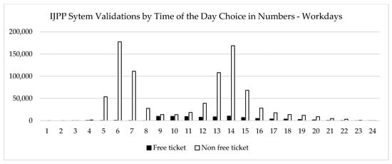 Time of the day choice comparison of free and non-free tickets validations in the IJPP by absolute numbers—workdays.