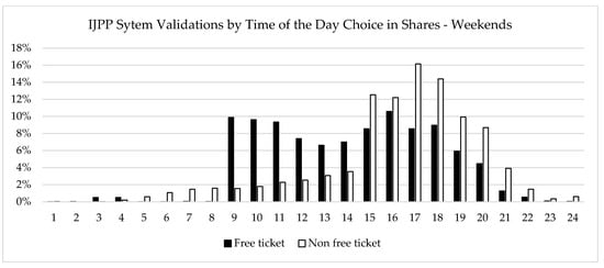 Time of the day choice comparison of free ticket and non-free tickets validations in the IJPP by shares—weekends.