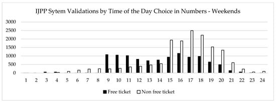 Time of the day choice comparison of free and non-free tickets validations in the IJPP by absolute numbers—weekends.