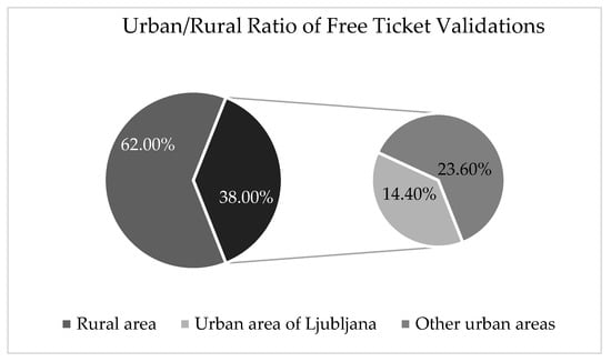 A comparison of the distribution of validations by part of the day shows that the time of the day choice of free ticket users differs significantly from other IJPP users’ traffic flows. Differences in the time of the day choice were determined based on a comparison of validations by region. Significant discrepancies were found in the distribution of validations of free and non-free tickets by region. Both, on weekday and especially on the weekends, significant deviations in the share of validations were found in the Gorenjska (up to 3.6 times higher), Obalno-kraška (up to 5.5 times higher), and Osrednjeslovenska region (up to 2.7 times lower). Deviations in the distribution of validations were recorded in other regions as well, but they were not as pronounced. The compared data shows differences in the distribution of validations by region and between validations in urban and rural areas. Data on urban areas were obtained based on a settlement where validation was carried out. These settlements with the same name as municipalities with the status of urban municipalities were considered urban areas. Among the validations of free tickets, the share of validations with a free ticket in a rural area was 58%, which indicates a significantly higher share of validations from rural areas. For non-free tickets validations, 62% of validations were performed in the urban area. Non-free tickets validations are also characterized by a very pronounced centralization of validations in the capital city of Ljubljana. 43.3% of non-free ticket validations were performed in the urban area of Ljubljana. For comparison, only 17.4% of free ticket validations in urban area of Ljubljana were recorded. A comparison of spatial distribution between free ticket and non-free ticket validations is shown in Table 6. Shares of free ticket validations in terms of rural and urban areas are shown in Figure 13.