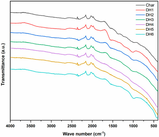 FTIR spectra were collected for the characterization of the surface functional groups of prepared activated carbon. Figure 1 depicts the FTIR spectrum of all activated carbons obtained after the chemical treatment with KOH followed by the different conditions, as shown in Table 1. The IR spectrum of the char sample was used to compare the spectra of the obtained activated carbons. We found that the weaker broad band around 3380 cm−1 revealed the stretching vibrations of the O-H bonds of the mixtures that were adsorbed onto the surface of activated carbon. A peak at around 2100 cm−1 shows the presence of a triple bond between carbon–carbon atoms (alkynes group) with stretching vibration [46]. Compared to the char spectrum, it was found that some changes could be noted in the position and intensity of some peaks in the activated carbon spectrum. A new strong peak appeared around 1030–1100 cm−1, which was because of the C-O stretching vibrations of carboxyl or carbonyl groups. This probably indicates the formation of an oxidation reaction during treatment with KOH in the activation process. Furthermore, we also found that the absorption peak in the regions between 1500 and 1600 cm−1 could be ascribed to C = C aromatic ring stretching vibration, which is generally found in carbonaceous material [47].