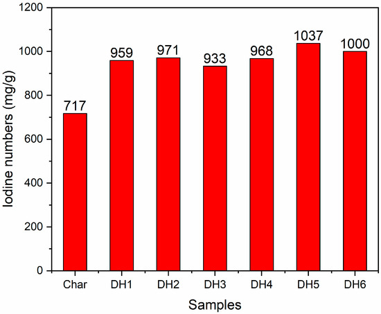 It is well known that the indirect value of the iodine number also indicates the porosity of activated carbon, which is correlated with the micropore volume. A higher iodine number meant a higher porosity on the surface determined by iodine absorption. Therefore, iodine number analysis was used to analyze the porosity of DH1–DH5, and char was also used for comparison. The iodine adsorption capacity of all the activated carbon is illustrated in Figure 2. It is confirmed that the process parameters affected the porosity of the obtained activated carbon, which was found to be higher than char. Besides this, we found that the impregnation ratio between KOH and char has a profound effect on the adsorption properties of activated carbon. At the given activation temperatures, the iodine numbers of the activated carbons increased with an impregnation ratio increased from 1:4 to 1:2 and decreased with the KOH:char ratio increased to 1:1. From our experimental results, the highest iodine number was achieved at the impregnated ratio of 1:2, as shown in Figure 2. The iodine numbers of char, DH1, DH2, and DH3 are 717, 959, 971, and 933 mg/g, respectively. In addition, the effect of the activation process on the adsorption capacity was studied. It was found that the iodine numbers increased with increases in the temperature of the second activation process, which can be compared with DH2 and DH5 in Figure 2. At the given impregnation ratio, DH5 showed the highest values, at 1037 mg/g, of its iodine number compared with the other activated carbon. This is probably due to the effect of pore structure formation within the char structure during the activation process. As mentioned above, the iodine number is commonly used in industries as a measure of adsorption capacity, reflecting the number of micropores in the carbon. This value indicates the approximate internal surface area of activated carbon. The relationship between the iodine number and the internal surface area of activated carbon has been well-established in the literature for various precursors [48,49,50]. It is well known that the iodine number has a direct proportional relationship with the specific surface area. Comparing recent studies, the iodine number of activated carbon from agricultural wastes has been reported to be up to 1000 mg/g, which is in accordance with the previous studies by Saka [51], Toledo et al. [52], and Anderson et al. [53]. Thus, the results of this study can suggest that the biochar from durian husk can be used as a candidate as a precursor in the manufacture of activated carbon with a highly porous structure for specialized industrial sorbents.
