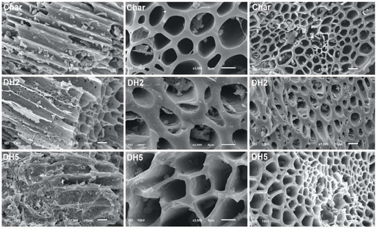 SEM images of the surface morphologies of char (upper), DH2 (middle), and DH5 (lower) with different magnifications.
