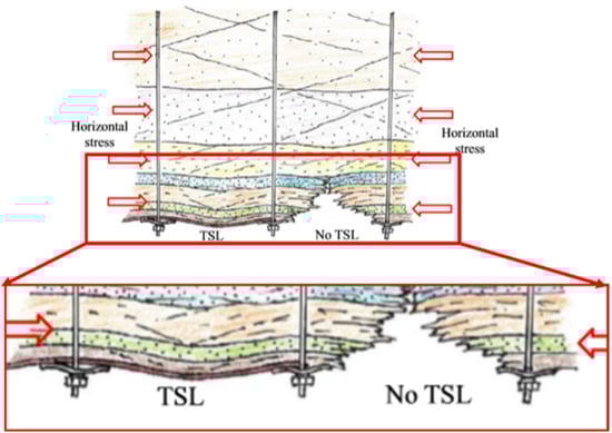A thin spray-on Liner (TSL) is a chemical membrane with a thickness of approximately 2–5 mm, which is sprayed onto the rock surfaces to support the rock mass [6]. TSLs comprise organic materials such as polyurethane, polyurea, acrylate, methacrylate and cementitious polymer. TSLs offer various advantages such as high adhesion properties, high tensile strength, prevention of air ingress in rocks and the ability to penetrate open joints and fractures of rock to be TSLs-rock composites [7,8,9,10,11]. They stick to the key loosen blocks of a rock mass and help interlock a fractured rock, and minimize the disintegration of loose rock. The support mechanism of TSLs presented in Figure 2.