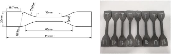 The tensile loading of the sample induced the highest stresses in the narrow sections of the center parts. The specimen must self-align with the direction of the pull to prevent inaccurate results owing to eccentric loading, The tensile strength was tested under the displacement control mode, and the loading and displacement were recorded through the testing process. The result was only considered valid when the dumbbell specimen broke at the narrow section, Figure 4 shows the results of this experiment, wherein five specimens are valid damaged, and the breaking site of sample number 18 is not in the middle; hence, the breakage is invalid.