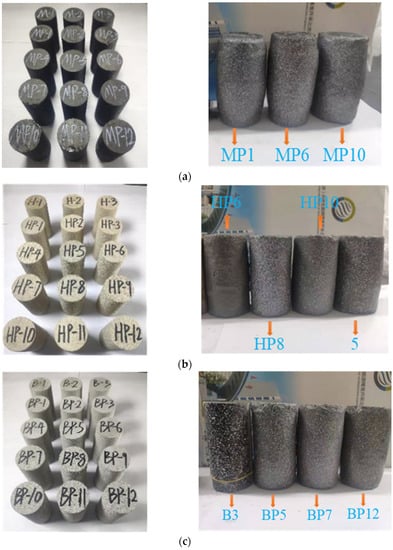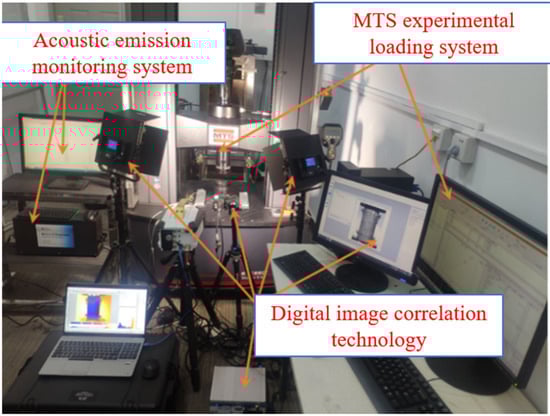 The reaction of material A and B was performed in a Graco E-10 hp mini chamber. The specimens were then sprayed with different coating thicknesses of the obtained TSL, which were 2 mm, 3 mm, 4 mm, and 5 mm. Uncoated specimen and those coated with the TSL are shown in Figure 6. The specimen surface was leveled with a scraper to maintain a uniform thickness. The coated and uncoated specimens were solidified in a constant temperature (25 °C) and humidity (50%) curing box for seven days. The UCS experiments were conducted on MTS E45.305, and the loading velocity was 0.1 mm/min. The rock mass deformation destruction characteristics, acoustic emission spatial-temporal evolution pattern and micro destruction mechanism of coated and uncoated specimens were analyzed.