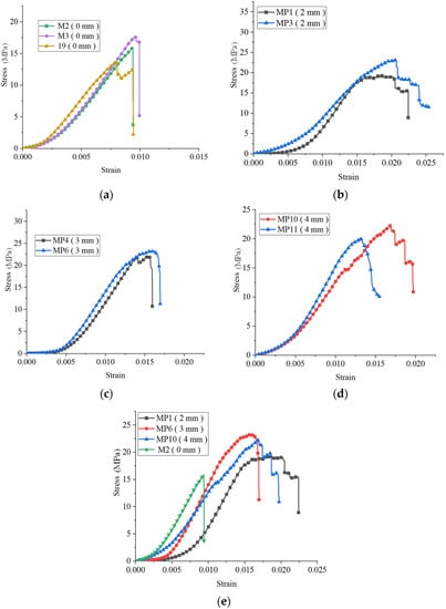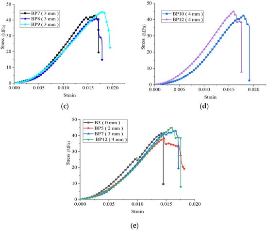 Comparison of stress and strain curves of white sandstone with different spray thickness: (a) TSL uncoated white sandstone, (b) 2 mm TSL coated white sandstone, (c) 3 mm TSL coated white sandstone, (d) 4 mm TSL coated white sandstone, (e) TSL coated white sandstone with different thickness.