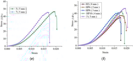 Stress-strain curves of yellow sandstone with different spray thickness: (a) TSL uncoated yellow sandstone, (b) 2 mm TSL coated yellow sandstone, (c) 3 mm TSL coated yellow sandstone, (d) 4 mm TSL coated yellow sandstone, (e) 5 mm TSL coated yellow sandstone, (f) TSL coated yellow sandstone with different thickness.