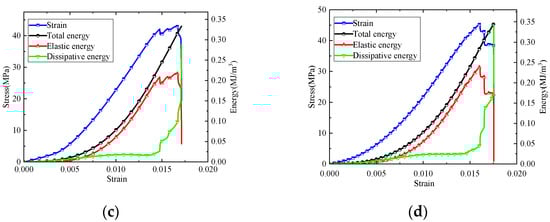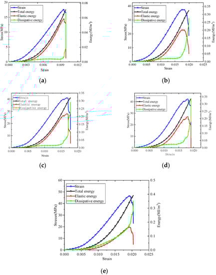 During the UCS experiment, the evolution of machine energy can be expressed by five different energies 5: Elastic energy is stored in the rock interior and escapes when the rock is deformed, it is the main source of energy disaster in rocks. Plastic energy occurs owing to the misalignment of the original crack and the yield of a secondary crack. Surface energy is the energy required for crack propagation when the fracture extends; hence, the plastic and surface energies are dissipative. Radiant energy will be produced when the coal and rock is loaded, and is a considerably lower than deformation energy. Kinetic energy will only be generated when the magnitude and rate of elastic energy release reach a certain level. To simplify the energy evolution of the rock during the uniaxial compression, kinetic and radiant energy were not considered. The plastic and surface energies combined to provide the dissipative energy [38,39,40].