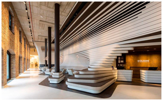 The interior of hotel lobby. Source: https://www.gradnja.rs/kako-su-stari-materijali-u-hotelu-stari-mlin-dobili-nov-zivot/ (accessed on 10 February 2017).