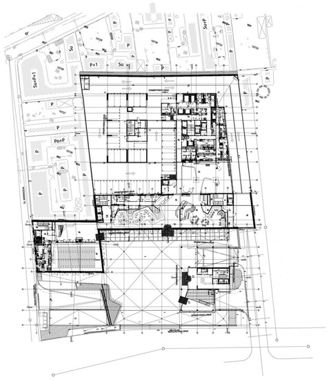 Ground floor plan. Source: https://arhitekta.co.rs/arhitektura-u-srbiji/radisson-blu-old-mill-hotel/ (accessed on 4 January 2022).