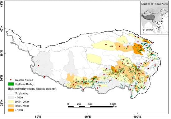Figure 1. The distribution of highland barley and county planting area in Qinghai–Tibet Plateau.