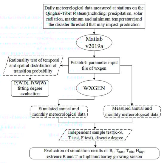 This paper uses WXGEN to simulate daily meteorological data, and then compares the results with the measured meteorological data in the highland barley planting area of the Qinghai–Tibet Plateau. This is done in the following five steps: (1) Based on the daily precipitation data of Qinghai–Tibet Plateau, call Matlab v2019a to establish the input file of the parameters required by WXGEN; (2) Calculate the transition probability and evaluate its temporal and spatial distribution, the theoretical basis of WXGEN; (3) Call WXGEN to simulate precipitation, minimum and maximum temperature and solar radiation; (4) Carry out an independent sample test and a dispersion test on simulated and measured meteorological data, then analyze the fitting degree of simulation results; (5) Based on the measured extreme weather indicators affecting crop yield and the simulated daily temperature and precipitation data, analyze the fitting degree of extreme weather affecting crop yield.