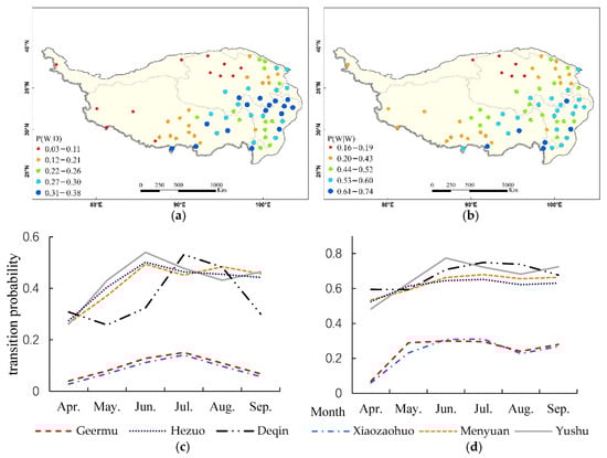 Figure 3. Temporal and spatial distribution of precipitation transfer probability of meteorological stations in the Qinghai–Tibet Plateau. (a) P(W|D) Spatial distribution; (b) P(W|W) Spatial distribution; (c) P(W|D) Temporal distribution; (d) P(W|W) Temporal distribution.