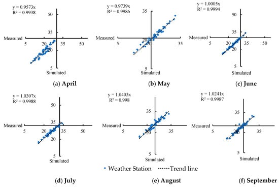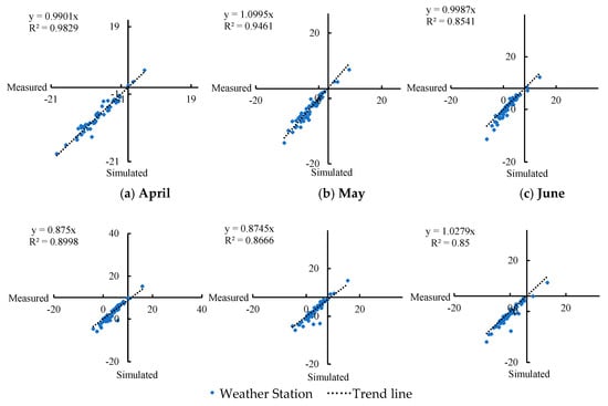 Figure 4. Scatter chart of monthly measured-simulated maximum temperature from April to September. (a) April max temperature not exceed 30 °C; (b) May max temperature not exceed 21 °C; (c) June max temperature not exceed 30 °C; (d) July max temperature not exceed 32 °C; (e) August max temperature not exceed 25 °C; (f) September max temperature not exceed 25 °C. Note: the first quadrant refers to the meteorological stations that may have extreme high temperatures affecting the yield during the growth period of highland barley.