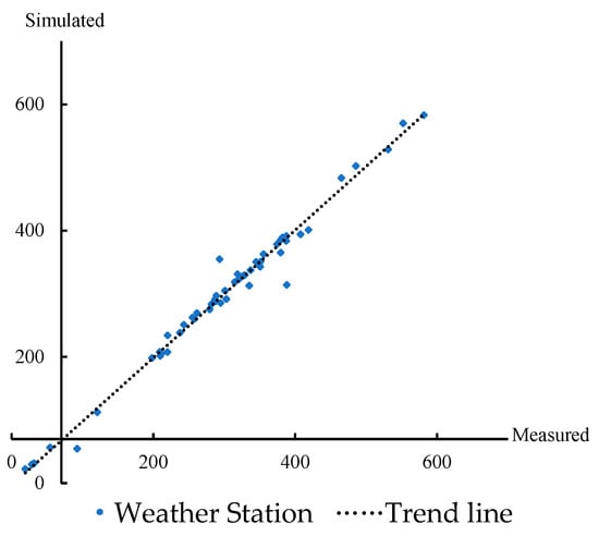 The dispersion degree test was carried out for the annual average radiation of each station, and the results are shown in Table 5. The average annual solar radiation reduction effect of each meteorological station is poor. Compared with the actual measurements, the simulation results are larger, with a deviation of 0.047 and an average annual RSME of 1.65 MJ/m2. The main reason for the large deviation is that a small number of meteorological stations have a large deviation, which affects the overall fit. WXGEN’s simulation deviation of annual average solar radiation in the growth period of highland barley on the Qinghai–Tibet Plateau is large, and the simulation value is too large as a whole.