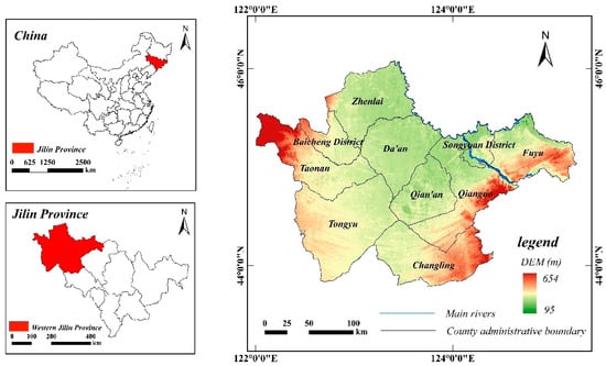 Western Jilin Province (121°38′~126°11′ E, 43°59′~46°18′ N) has a total area of about 4.67 × 106 ha, accounting for 25.4% of the whole of Jilin Province (Figure 1). It is located in the north end of Liaohe plain, the east of Horqin prairie and the southwest of Songnen Plain. It includes ten county-level administrative regions: Baicheng district, Songyuan, Da’an City, Qianguo County (Mongolian Autonomous County of Qian Gorlos), Qian’an County, Fuyu District, Taonan City, Tongyu County, Changling County and Zhenlai County. The terrain is vast and high in the northwest and low in the middle, slightly uplifted in the middle and south. As a semi-humid and semi-arid area, the annual precipitation in the study area is 300~500 mm, and the average relative humidity is 60~65%; the frost-free period is 140~160 D. In 2020, the total population in western Jilin Province reached 4.59 × 106 people, with a regional GDP of 1.26 × 103 million yuan. The total grain output reached 1.21 × 107 tons, and the total meat output reached 3.82 × 105 tons. As a national grain warehouse, the demand of grain output and economic development has brought great pressure to the region. The contradiction between the demand for construction land and cultivated land protection has become more and more obvious, and the conflict between different land-use functions has grown more and more prominent.