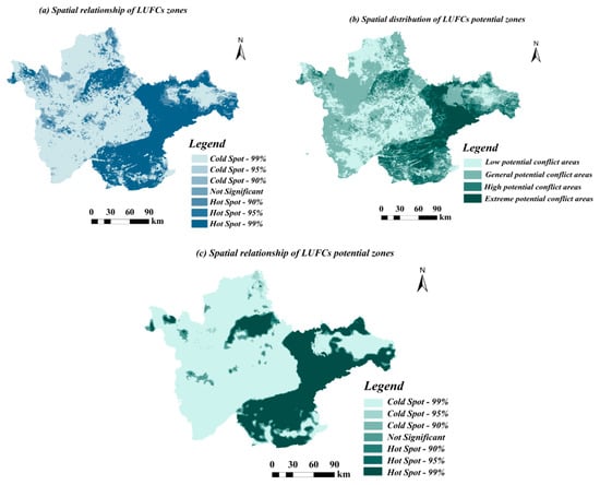 We used the method of cold and hot spot analysis to reflect the spatial relationship of LUFCs and conflict potential, obtained the distribution of “cold spots” and “hot spots”, and determine the agglomeration location of LUFCs and the LUFCs’ potential.