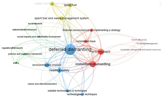 In Section 5.2, nuclear-decommissioning strategies and the eight general factors adopted in articles were analyzed in terms of each strategy’s adoption process. When using the analyzed results, VOSviewer software was used to conduct a co-occurrence network analysis. The subfactors of the eight general factors were also analyzed in the article keywords. For reference, the subfactors included policy, commercial issues, spent fuel, health and safety, knowledge management, social impacts, technologies and techniques, reactor and site characteristics, the regulatory framework, the waste management system, the environmental impact, human resources, and stakeholder involvement. As a result, a network between the index keywords was generated, as shown in Figure 3.