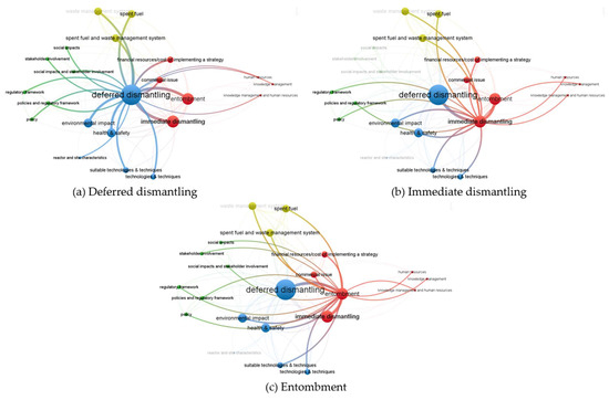 Cluster 2 is a cluster that is connected with seven items: ‘ID’, ‘entombment’, ‘commercial issue’, ‘financial resources/cost of implementing a strategy’, ‘human resources’, ‘knowledge management’, and ‘knowledge management and human resources’. Both ID and entombment belong to this part of the decommissioning strategies. Out of the eight factors, it is closely related to financial resources/cost of implementing a strategy (F2) and knowledge management and human resources (F5). In particular, among the subfactors, the ‘commercial issue’ was mentioned often in research on the ID strategy and the entombment strategy, although its co-occurrence frequency was not that high. Figure 4b,c show the detailed analysis results for the ID and entombment strategies.