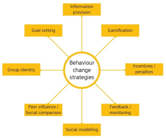 Various behaviour change interventions/strategies are found in the literature, summarized in Figure 2. Such interventions may take the form of “antecedent strategies” or “consequence strategies” [34]. “Antecedent strategies” target underlying behavioural determinants prior to the behaviour itself. They may include information provision, commitments, goal setting, peer influence, social modelling or the use of social/group norms.