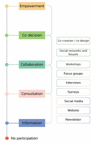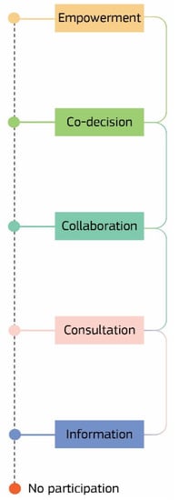 An oft-used model to describe the different degrees of empowerment in citizen participation in (public) decision-making is Arnstein’s ladder of citizen participation [41], which visualises public participation as ranging from passive involvement of citizens as recipients of information or announcements, or respondents to consultations or surveys, through to active participants or owners of the process itself. Figure 3 shows an adapted version of Arnstein’s ladder, inspired also by [42,43].