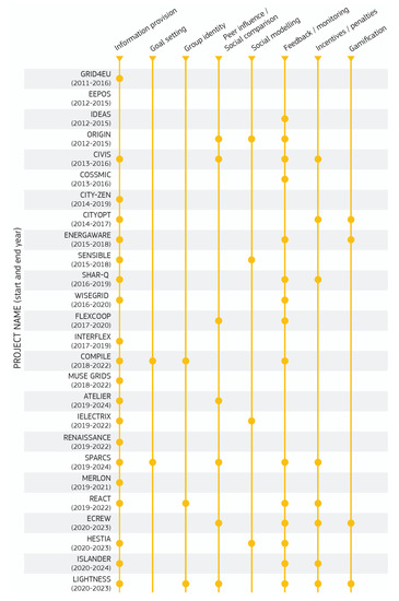 Seven projects used this strategy, sometimes in combination with gamification (e.g., ECREW, LIGHTNESS). The ORIGIN project, for example, in addition to energy monitoring, also mapped the buildings that participated in the project and colour coded them showing energy consumption in relation to the average, e, using normalised indicators.