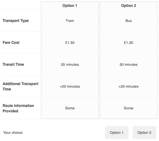 The selection of attributes is critical to the validity and strength of the DCE [39]. Using existing literature, the factors most important to users when using public transport were reviewed. Workshops were run with experts from Cenex and Nottingham City Council to determine the most appropriate and relevant list of attributes. Given the need to understand transport usage, these attributes were focussed on service-related attributes only. These attributes were collaboratively discussed, resulting in a shortlist of five, as is the standard procedure in many studies that have implemented DCEs [37,42]. For each attribute, three levels were chosen (except for transport type which had four levels). These levels were also the result of a detailed review of literature and UK governmental data from the Department for Transport (DfT) (and other sources) to gain extant market values as well as collaborations with transport research experts.