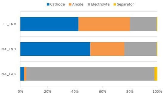 Mass composition of the Na_Lab battery was determined by primary data, choosing the best performing coin battery described in [20]. The Na_Ind mass composition was determined by combining primary data and assumptions for possible industrial development, considering the current LIBs. In particular, it was established that the maximum amount of cathode material that the coin could contain, hence the corresponding amount of anodes material. The selection and the proportion of nonactive materials (separator, binders…) and electrolytes were deduced from [21] in order to simulate industrial production (similar to [13]). Further details of the hypothesis for Na-Ion industrial batter are reported in Table 3 and in Section 3.2.