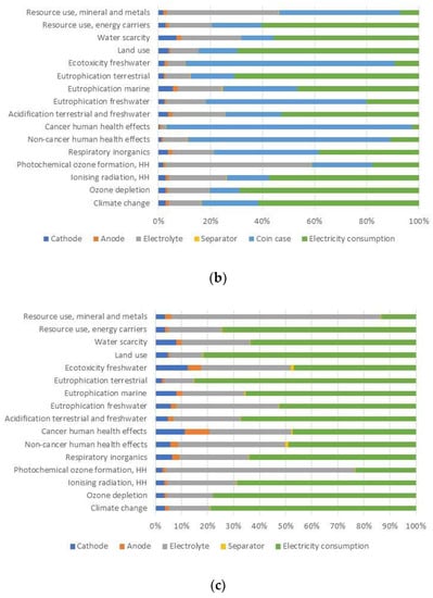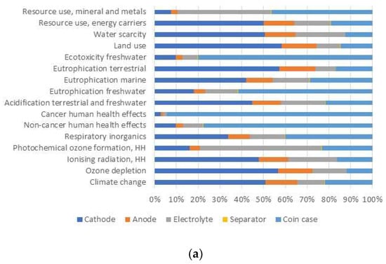 If coin case contribution is excluded (which is about 82% by weight of the battery, Table 3), the electrolyte contributes 16% to the GWP indicator, followed by the cathode, anode, and electrolyte. For details, see Figure 4.