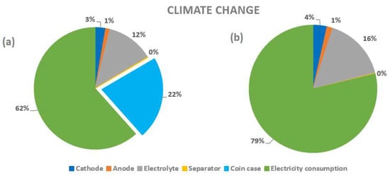 The energy necessary to produce the battery is one of the main contributions to the Climate Change indicator, representing 62% of it. If the coin case is not considered, the contribution rises to 79% (Figure 4).