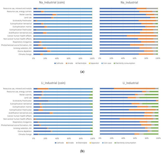 The positive electrode production is the main contribution to the CC impact indicator for both batteries (contributing 67% in the case of Na_Ind and 59% in the case of Li_Ind). During Na cathode production, the most impacting process appears to be the ink production phase, the cathodic active material production, and the use of citric acid (Sankey diagrams can be found in the Supplementary Materials (Supplementary Materials, Section S3). The same result is observed for the Li_Ind; the most impactful process is the production of cathodic active materials.