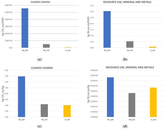 Figure 6 shows the results of the impact assessment for the impact categories of Climate change and Resource use, minerals and metals, expressed in 1 kWh of capacity and 1 kg of battery. These are two of the most relevant categories for the energy transition: the first (Climate change), since it constitutes its objective, and the second (Resource use, minerals and metals), as it is the one that potentially contains the greatest risks [19].